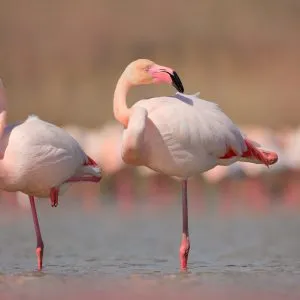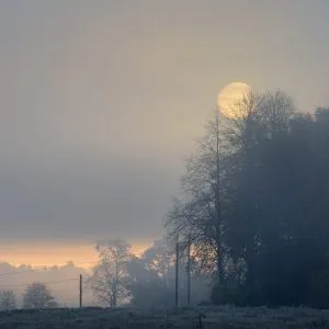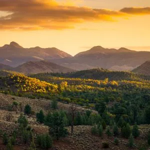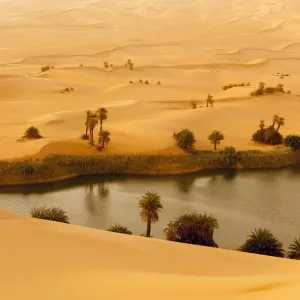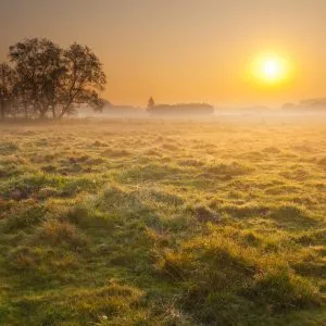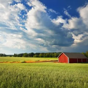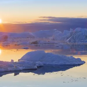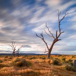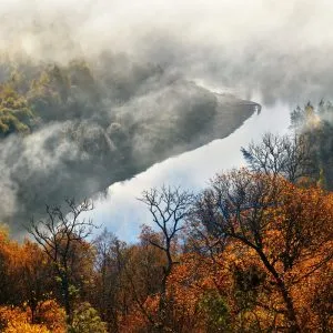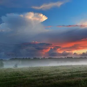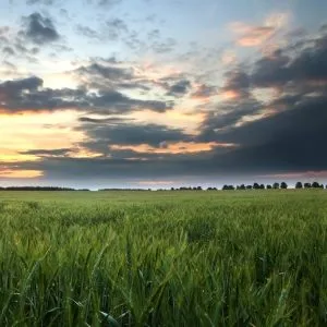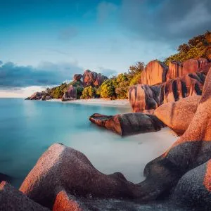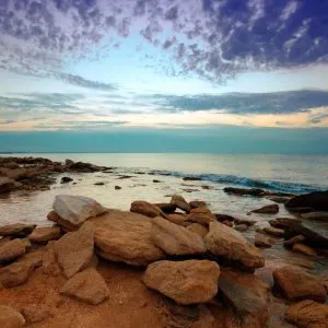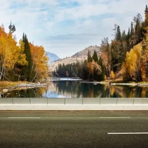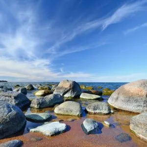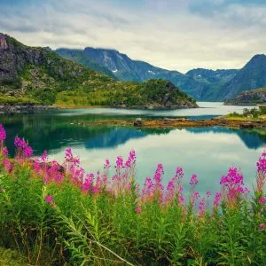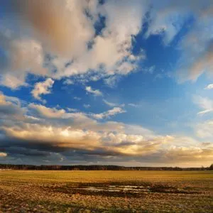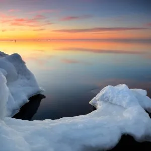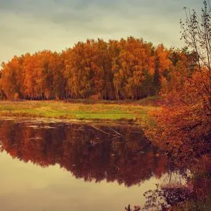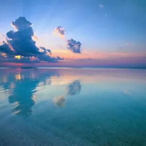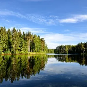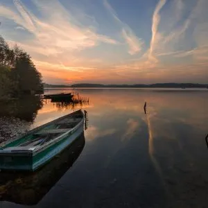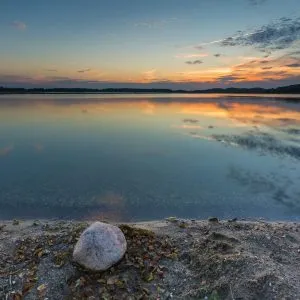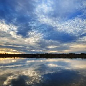 Beautiful lake at sunset with slightly cloudy sky reflecting in water