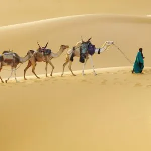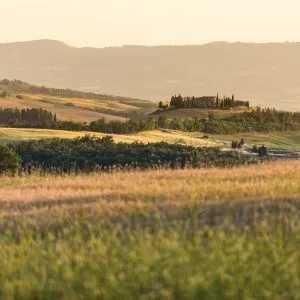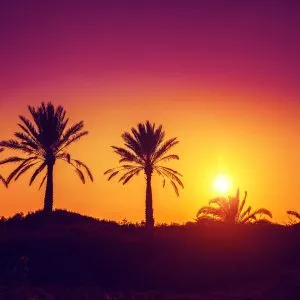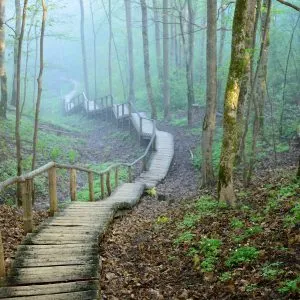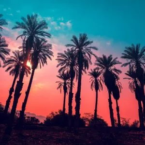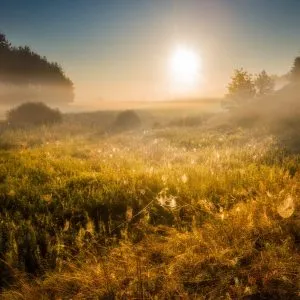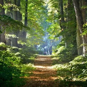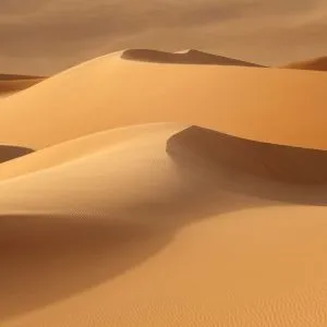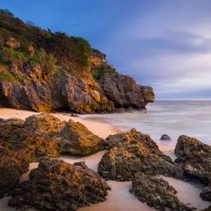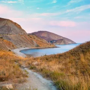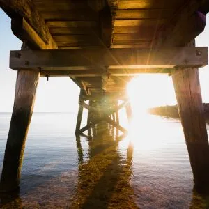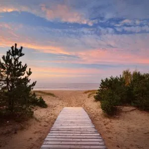 Wooden path to the Baltic Sea surrounded by sand and vegetation at sunset