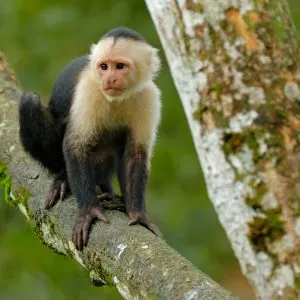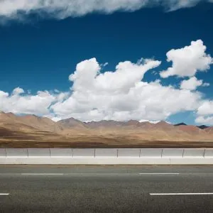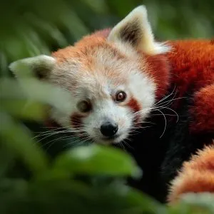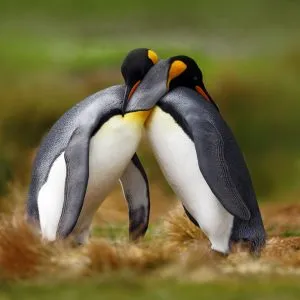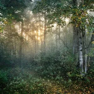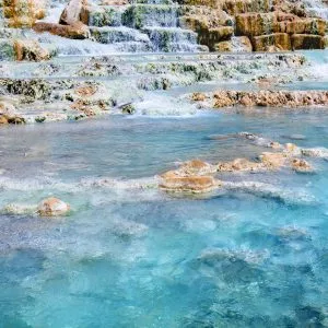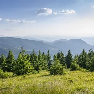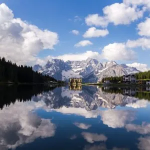 Misurina lake surrounded by pine trees and with mountains in the distance