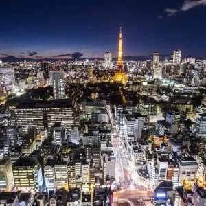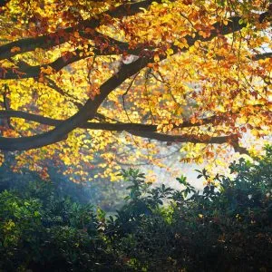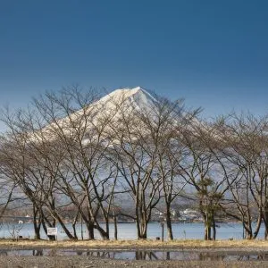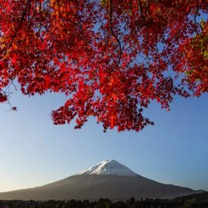 Red autumn leaves with beautiful Mt. Fuji in the distance