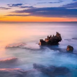 Corny Point Lighthouse with rocks in the foreground and Milky Way in the background