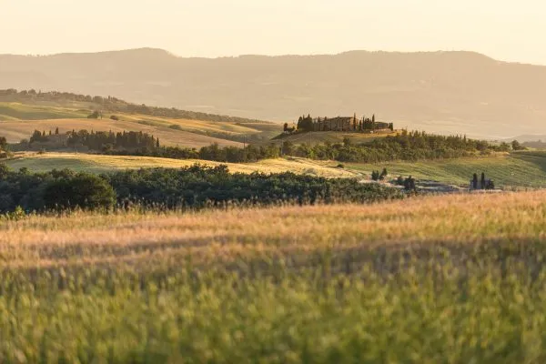 Beautiful Italian meadow with houses and mountains in the distance