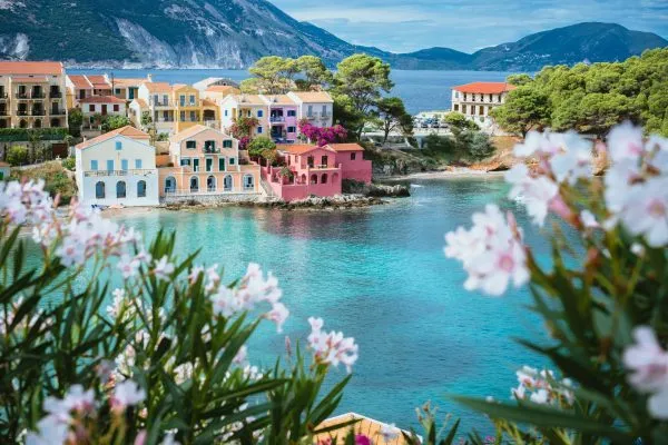 Turquoise Bay with Lilacs in Kefalonia, Greece